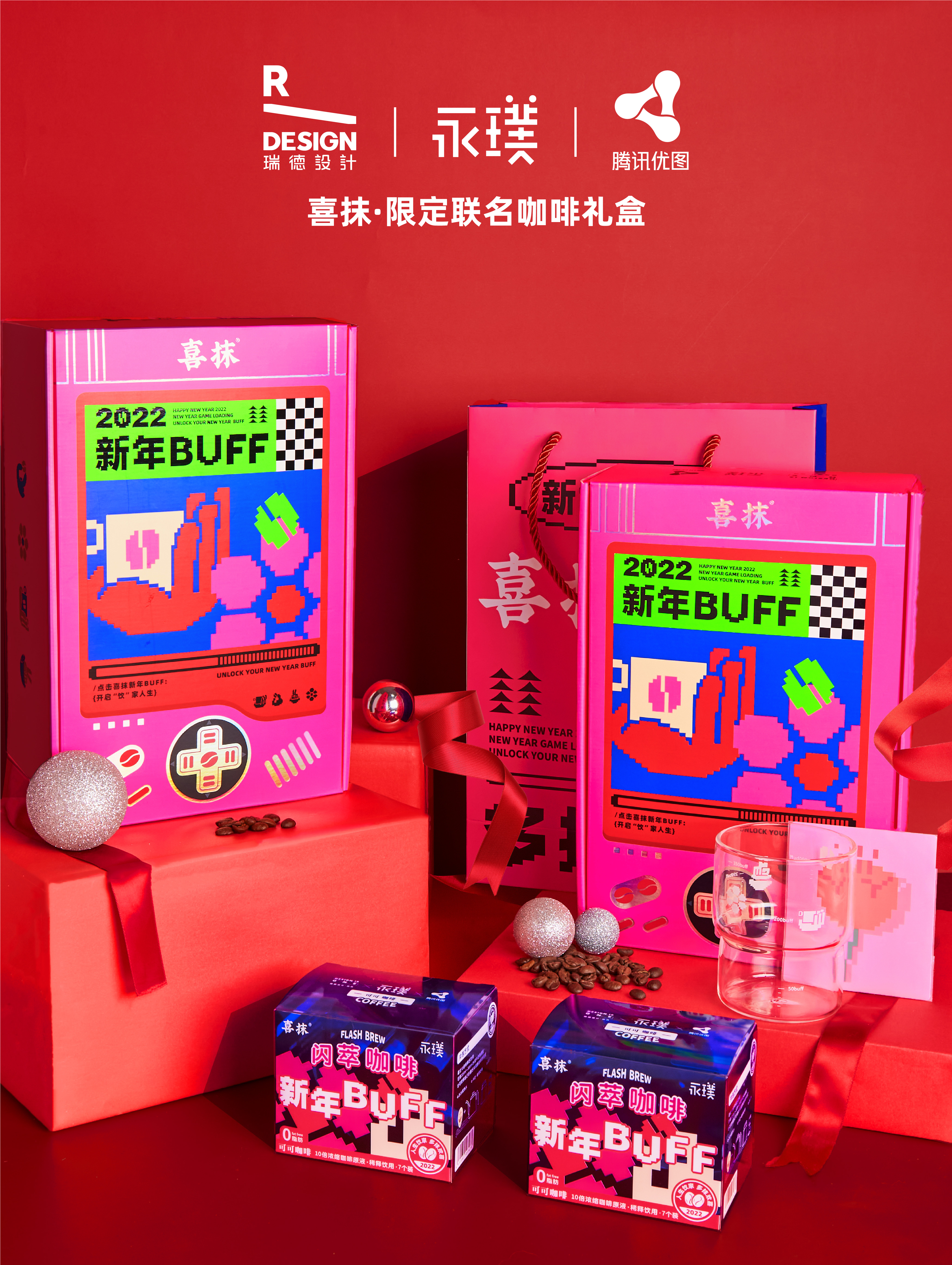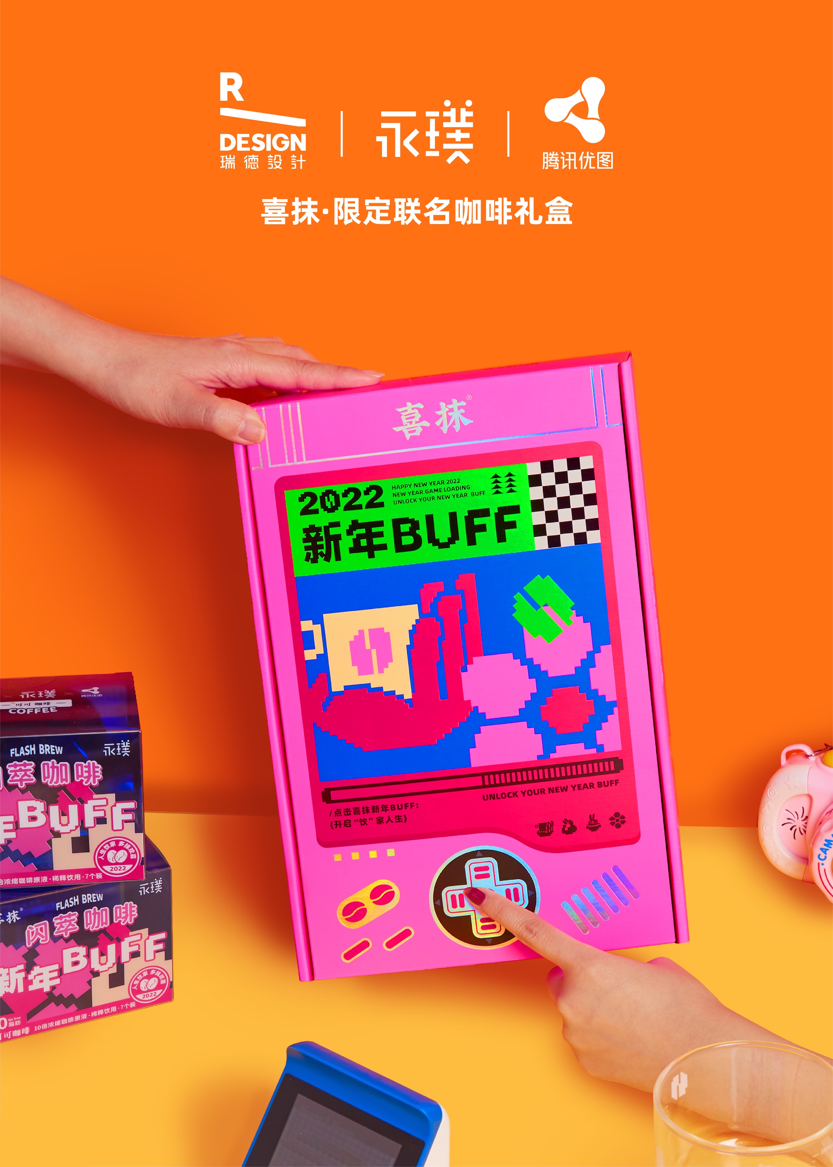 2022年新年之際,由瑞德設(shè)計(jì)創(chuàng)意策劃設(shè)計(jì)、永璞咖啡美味靈感植入、騰訊優(yōu)圖實(shí)驗(yàn)室交互技術(shù)加持,三方聯(lián)合推出了2022創(chuàng)意年禮「喜抹·新年BUFF限定聯(lián)名咖啡禮盒」。禮盒以“新年BUFF”為主題,搭配復(fù)古游戲機(jī)潮趣造型,結(jié)合潮流像素風(fēng)與大膽撞色,寓意2022好運(yùn)加滿,一路通關(guān)!