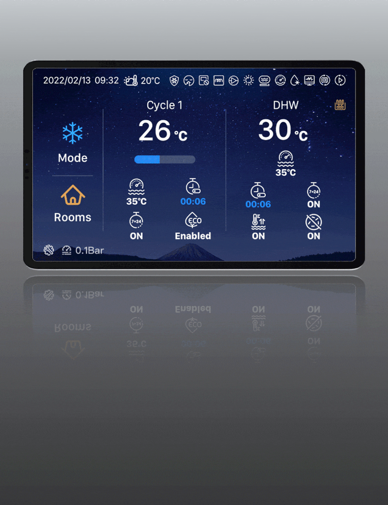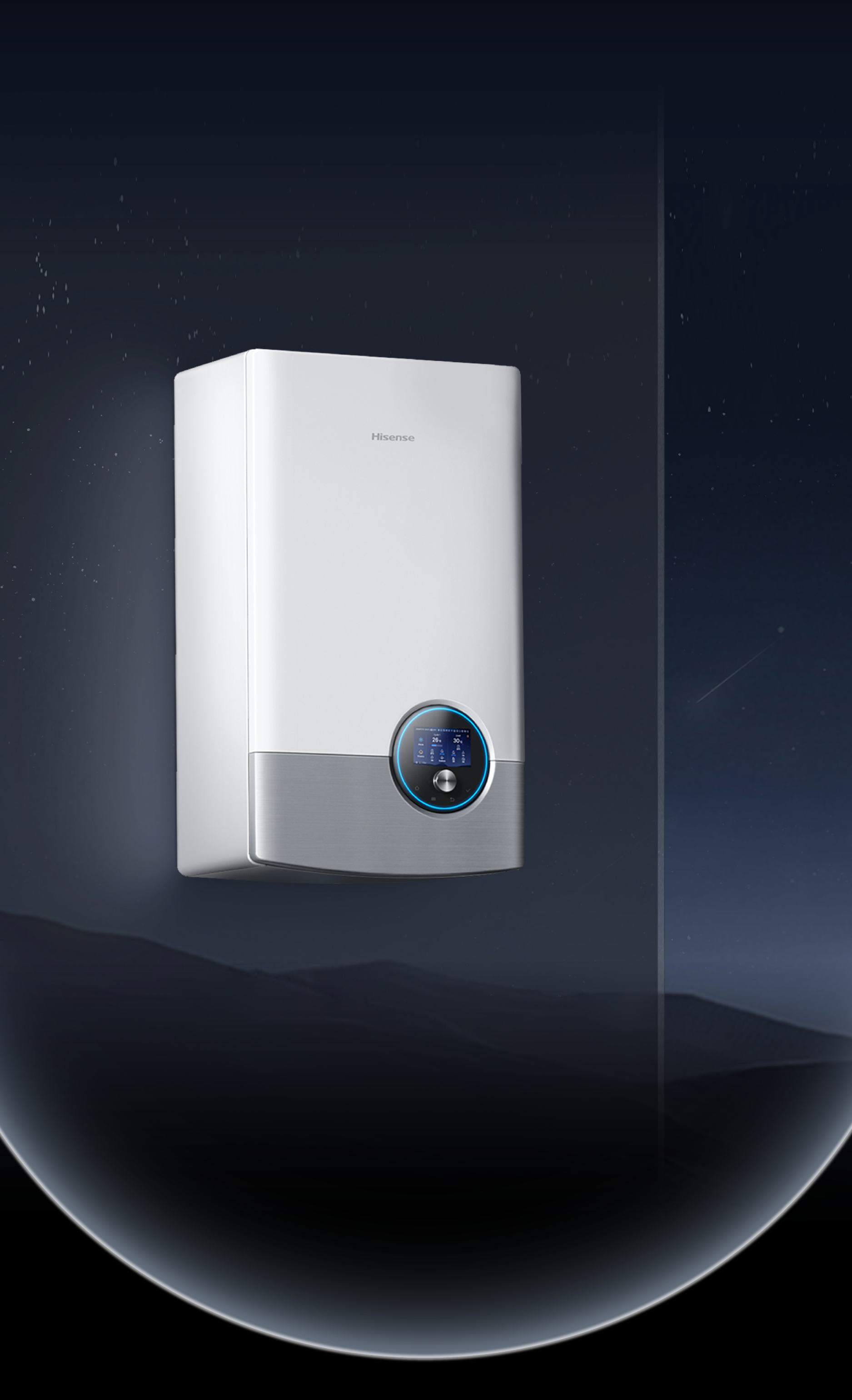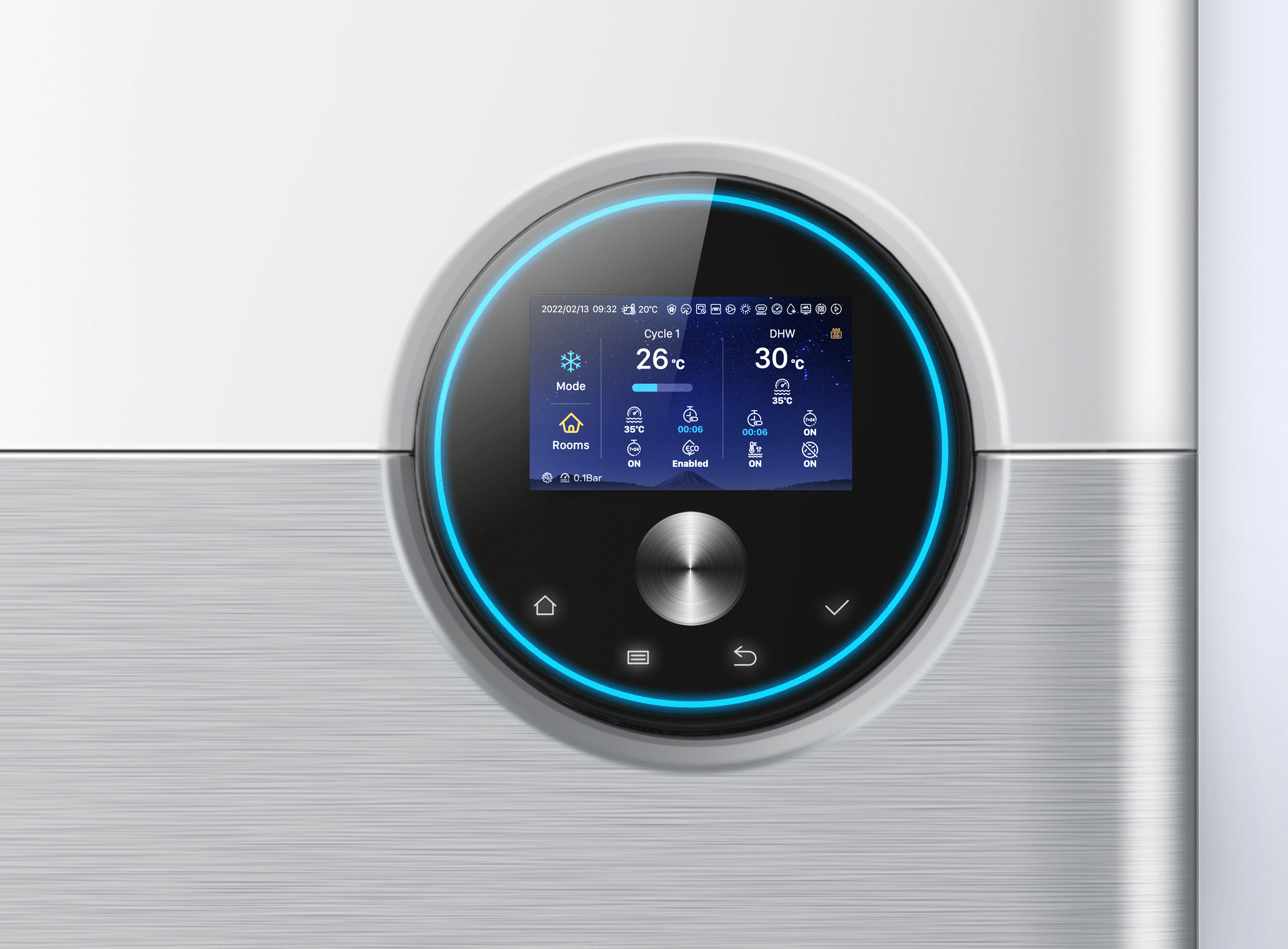 然而,標(biāo)志性產(chǎn)品符號的應(yīng)用并不局限于此。設(shè)計團隊還賦予了“環(huán)形”符號操作功能——將實時顯示循環(huán)設(shè)置及水溫的彩色操作屏幕與旋轉(zhuǎn)機械按鈕整合于圓形操控模塊之中,用戶得以隨時調(diào)整產(chǎn)品設(shè)置,解鎖冬暖夏涼的舒適生活。