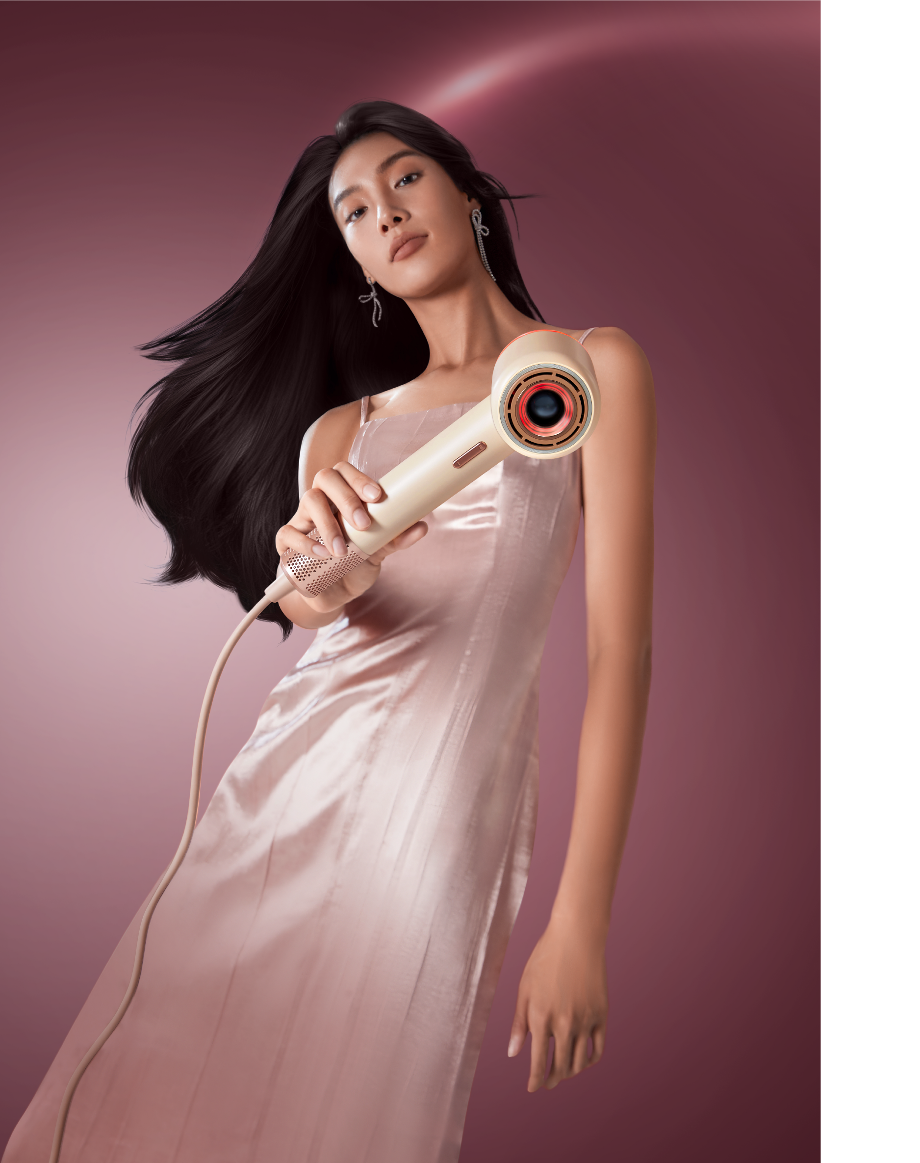 通過(guò)對(duì)目標(biāo)用戶群體的精準(zhǔn)洞察,提取「科技環(huán)」作為產(chǎn)品視覺(jué)符號(hào)中心,將LLLT低能量紅光、菁純水光環(huán)、負(fù)離子等養(yǎng)護(hù)固發(fā)新科技置入其中,打造第一眼記憶錨點(diǎn),建立產(chǎn)品“光愈護(hù)發(fā)”的科技感知。基于用戶使用習(xí)慣,將調(diào)溫方式設(shè)為多檔位無(wú)極調(diào)溫,結(jié)合燈帶形成全新交互形式,搭配微風(fēng)速檔位,滿足用戶護(hù)發(fā)、造型等多重需求,輕松打造精細(xì)化造型。