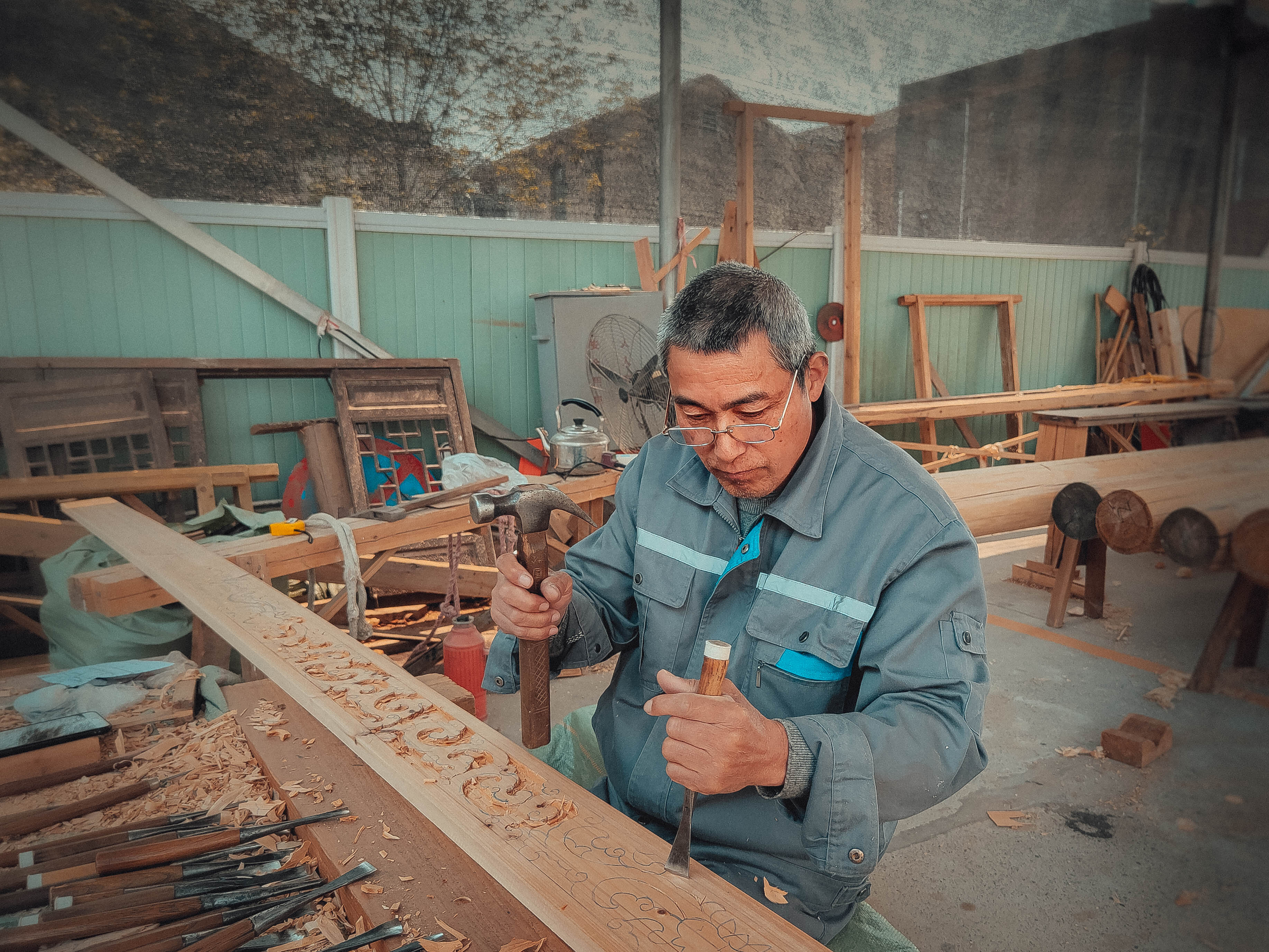 該作品素材來(lái)源于路橋分公司承建的練市大運(yùn)河歷史文化街區(qū)改造工程,照片中一位木雕師傅正專心致志地進(jìn)行傳統(tǒng)手工雕刻墻板,專注的神情很讓人動(dòng)容。正是有了這一代代的傳統(tǒng)手工雕刻藝人的不斷傳承和發(fā)展,才能將這門擁有悠久歷史源流、博大精深的中華傳統(tǒng)藝術(shù)發(fā)揚(yáng)光大,這份用精雕細(xì)刻詮釋的“匠人精神”值得頌揚(yáng)。
