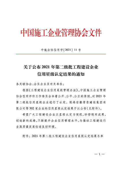 6月28日,工程建設(shè)行業(yè)信用體系建設(shè)平臺(中施企協(xié)信用字【2021】11號)發(fā)布2021年第二批工程建設(shè)企業(yè)信用星級認(rèn)定結(jié)果,中國二冶獲得“工程建設(shè)企業(yè)信用星級18星級”。
