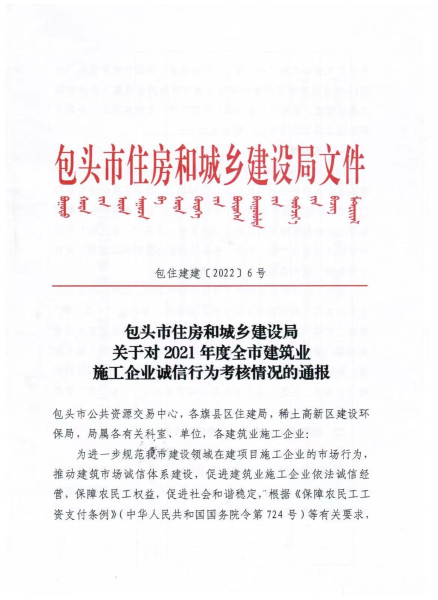 4月17日,中國二冶收到包頭市住房和城鄉(xiāng)建設(shè)局發(fā)布的《包頭市住房和城鄉(xiāng)建設(shè)局關(guān)于對2021年度全市建筑業(yè)施工企業(yè)誠信行為考核情況的通報》,對中國二冶在建筑市場的誠信行為予以表揚(yáng)。