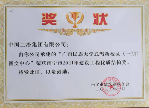 5月10日,由南寧市建筑業(yè)聯(lián)合會公布的關(guān)于2021年第三批建設(shè)工程質(zhì)量優(yōu)質(zhì)結(jié)構(gòu)獎獲獎表彰名單中,由中國二冶承建的廣西民族大學(xué)武鳴新校區(qū)(一期)工程中的單體工程——圖文中心獲得“南寧市建設(shè)工程質(zhì)量優(yōu)質(zhì)結(jié)構(gòu)獎”。